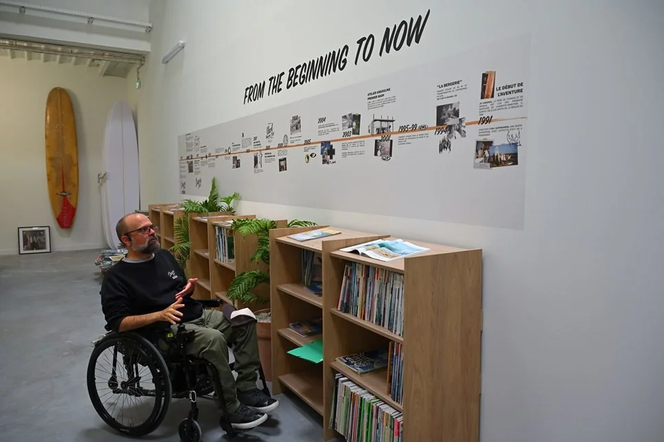 Thomas nous explique comment le Shapers Club est né comme un espace ouvert aux shapers venus du monde entier : Australie, Hawaï, Afrique du Sud, États-Unis… Chacun apprécie de venir « en résidence » au sein de l’atelier pour y apporter sa culture, son savoir-faire et son style, créant une véritable communauté internationale autour de l’artisanat du surf.